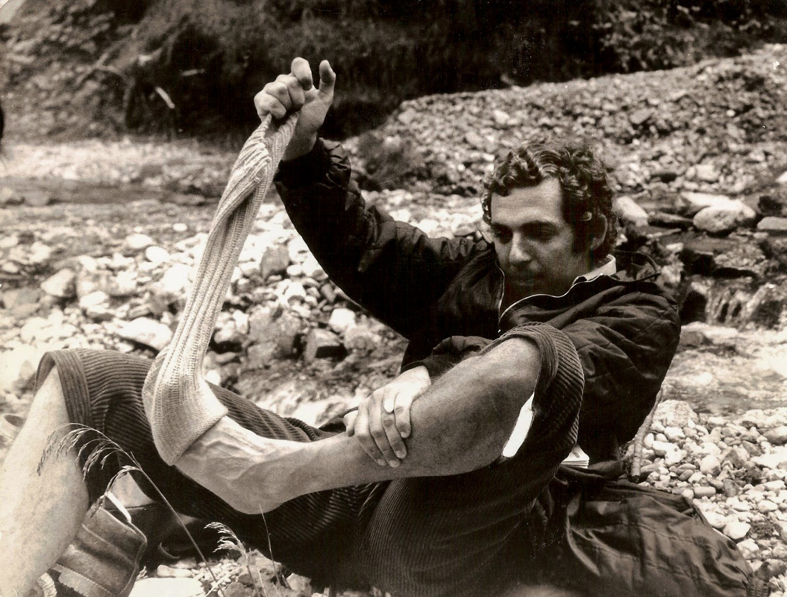 Certo che quella volta in cui mi sono perso tra i boschi del Resciesa andando a funghi e sono sbucato fuori verso le undici di sera sulla strada statale in un punto che ero quasi arrivato a Santa Cristina anziché ad Ortisei, nutrendomi solo di fragole e lamponi, magari un trafiletto, anche nella cronaca sportiva, il Gazzettino o l'Adige dell'epoca potevano dedicarmelo, anche perché comunque avevo con me una decina di porcini, un paio di sbrise e oltre un chilo di finferli, che era pur sempre un gran bel risultato (servì a mitigare l'incazzatura di mia madre una volta rientrato a casa con l'autostop). La drammatica immagine che riporto qui sotto è di quegli anni e mi ritrae in mezzo ai boschi gardenesi nel momento in cui attraversando a guado un torrente ero scivolato e avevo messo lo scarpone in acqua costringendomi alla manovra di emergenza dello strizzamento del calzettone di lana, proprio come Messner durante la scalata della parete sud dell'Annapurna.